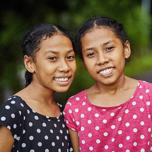 Her er Selvi og Olvi. De er 11 år og tvillinger. De bor på en lille ø langt fra byen, som hedder Lembata. Solen skinner næsten hele året og det er varmt og meget tørt. Men i nogle måneder er det regntid. Her kommer der store storme og meget regn på kort tid.